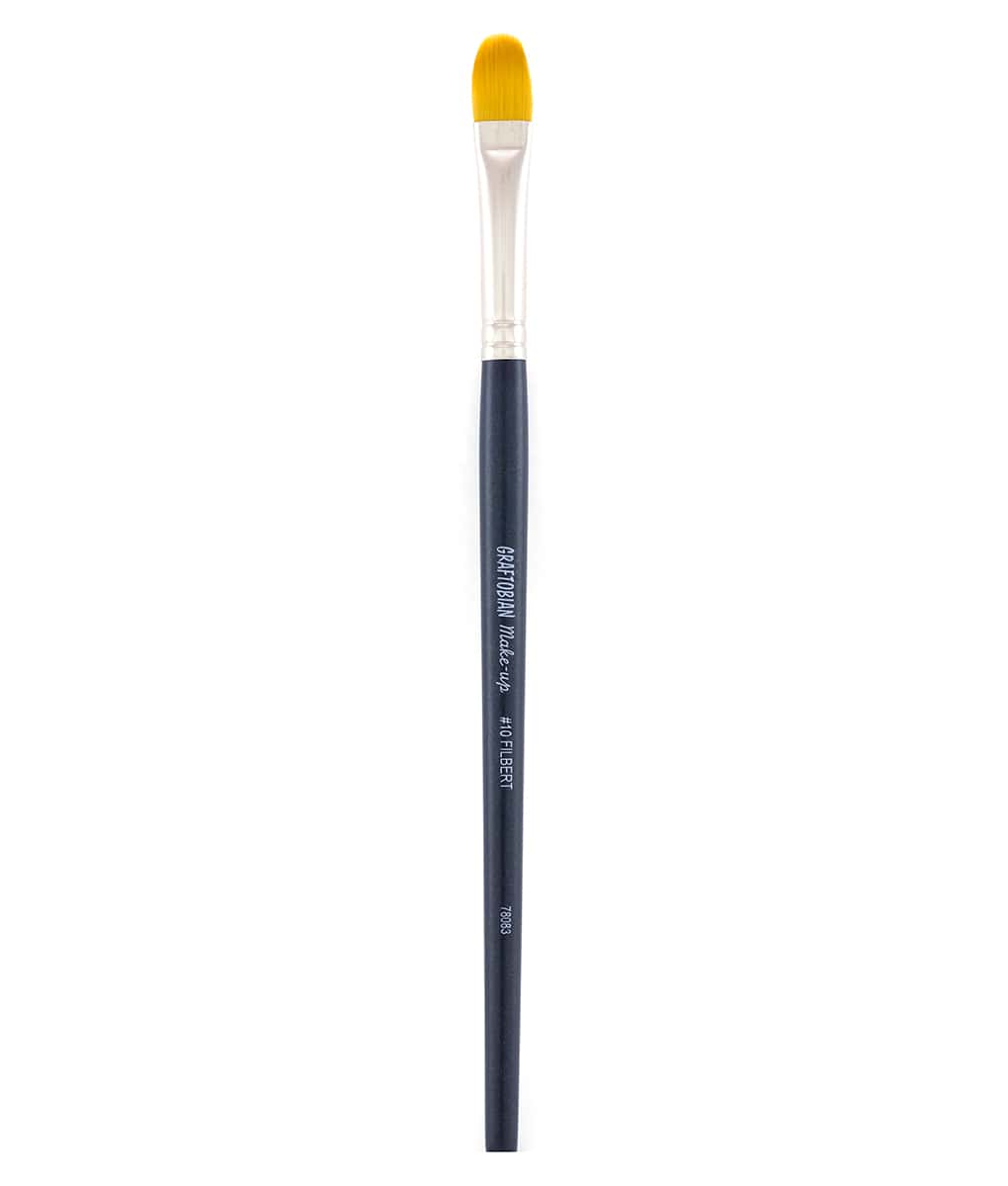 To satisfy our strict requirements, our brushes are made from synthetic fibers, long known for their durability, resilience and quality. They allow face and body painters to perform artistry properly and professionally. These brushes will perform well with either Disguise Stix® Face Paint or ProPaint™ Professional Body Paint. Filbert Brushes, Like this #10 filbert have multiple uses. Similar to flat brushes, they make lines or fill blocks of color. However, the rounded edge means no harsh edges for a softer, more natural feel. Long bristles make flowing strokes a breeze. Use the shape of the brush to create easy flower petals or fish scales. This #10 filbert brush is ideal for creating medium lines and details, as well as filling in medium blocks of color.