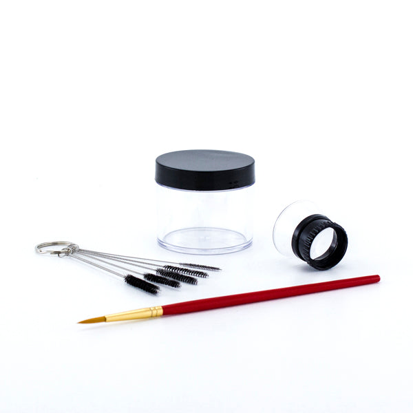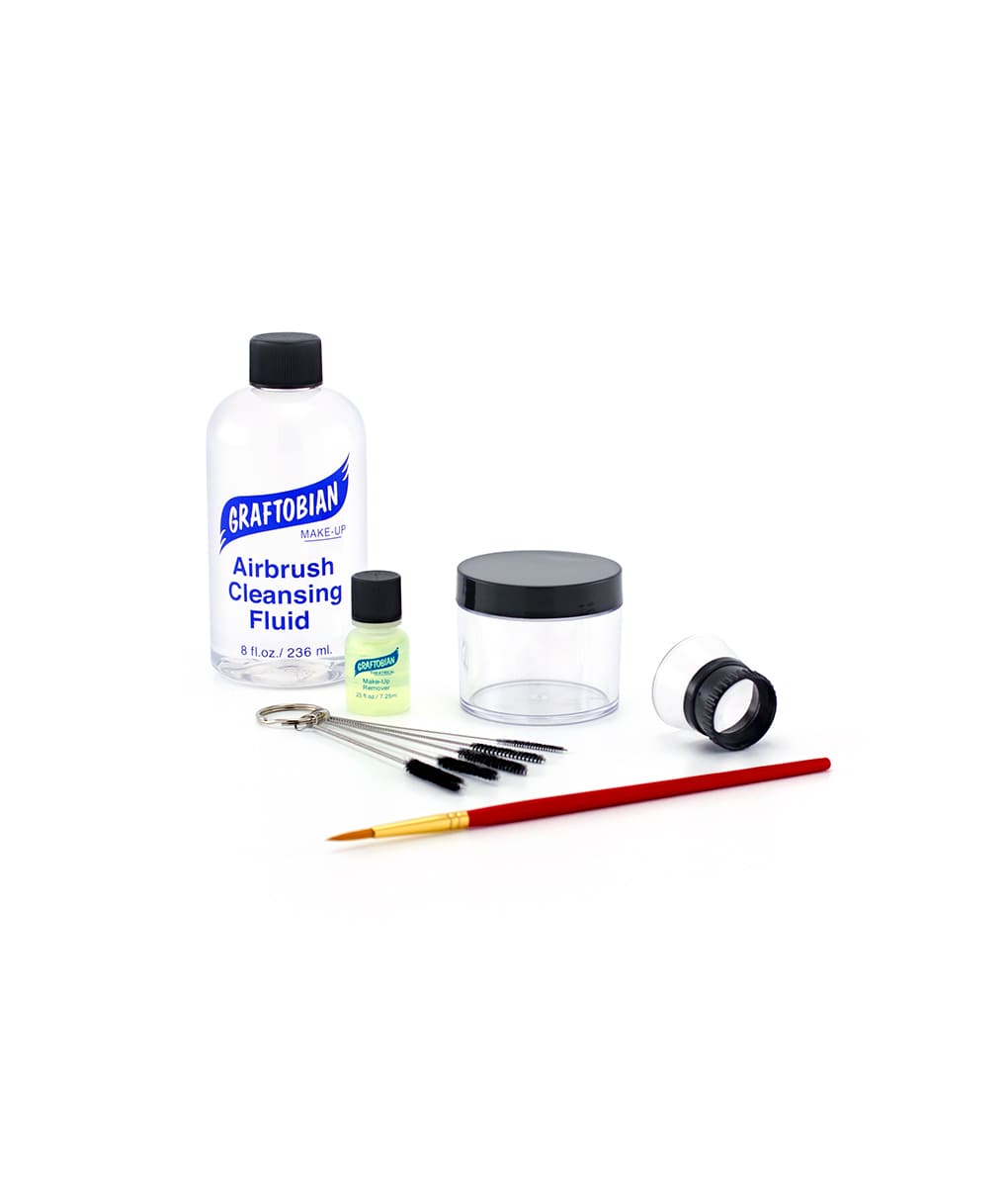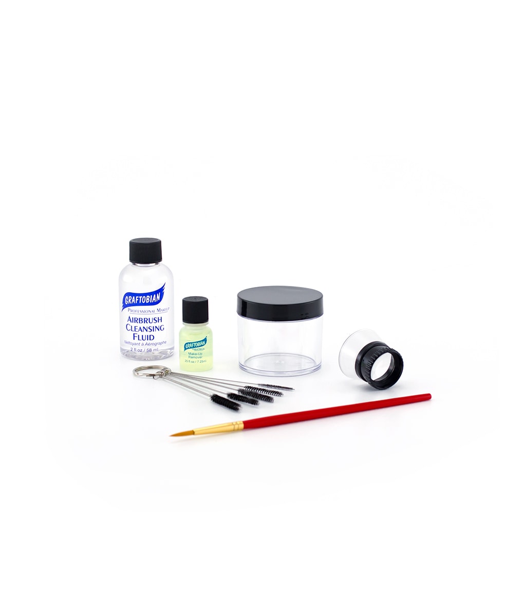 Over 90% of airbrush problems are the result of a dirty gun, and nothing can ruin a makeup artist's day faster than a malfunctioning gun. Graftobian's Airbrush Cleaning Kits come with everything you need to keep your airbrush gun clean and in great working order. Soak small parts, or the entire front of the gun in the jar. Then use the various brushes and airbrush cleansing fluid to remove makeup from cup all the hard-to-reach places. Check for tiny clogs or damage with the handy magnifying glass. Finally, lubricate the needle with a little makeup remover for smooth operation.