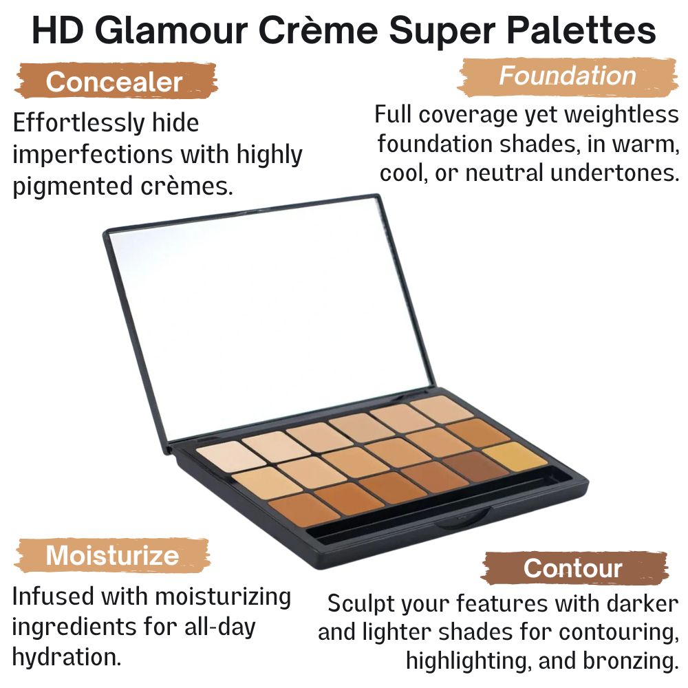 A favorite of makeup artists, each Super Palette contains 18 shades of HD Glamour Crème™ full coverage, weightless foundation.