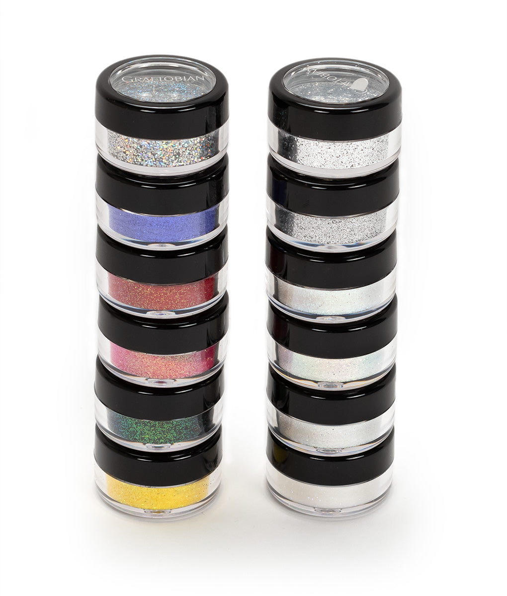 Twelve different colors of powdered glitter are included in this assortment. This glitter is the ideal choice for use on the face and body. This glitter can be used with Disguise Stix, ProPaint, and any medium that is still moist. Mix with Magic Set™ Mixing Medium for lining, or clear GlitterGlam™ Liquid Skin Sparkle for coating the lips. Sprinkle over dried black latex for detailed, durable glitter tattoos, or wet nail polish for amazing nail art.