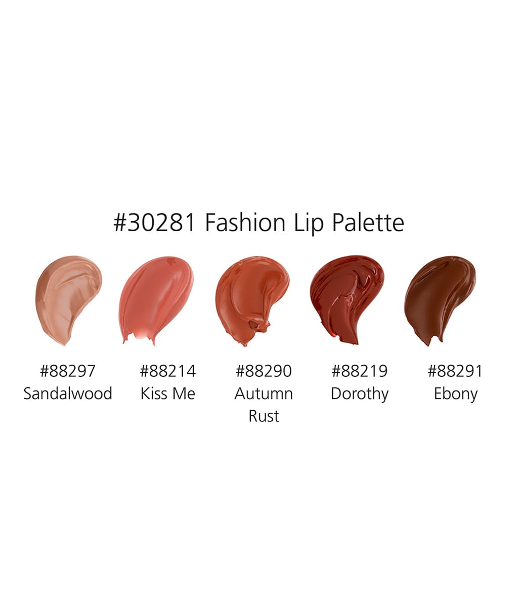 Fashion Lip Palette -- This palette contains very fashionable, natural earth tone shades. Colors include Sandalwood, Kiss Me, Autumn Rust, Dorothy, Ebony