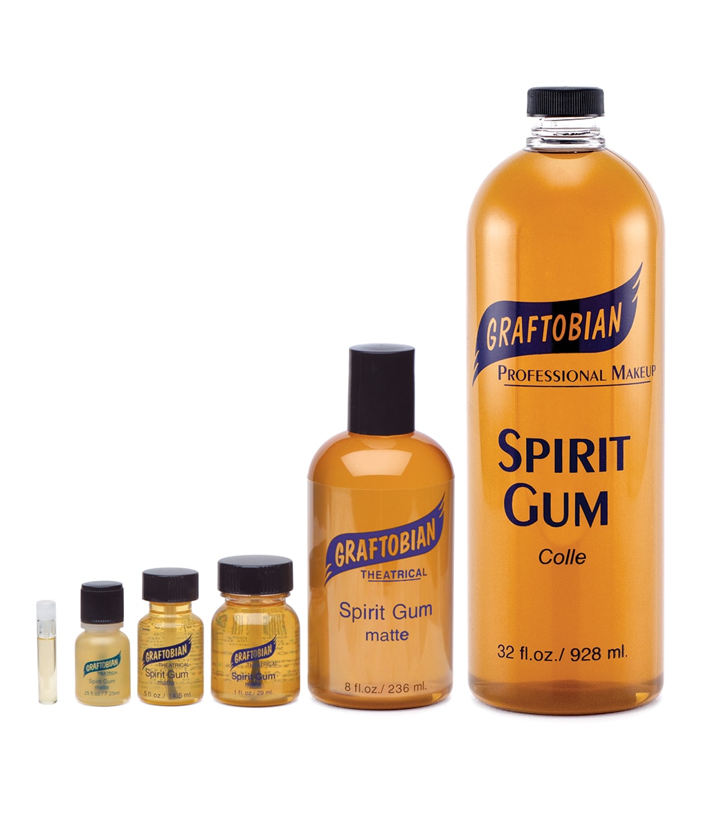 We sell spirit gum in a number of different sizes. Use the 1 mil vial for applying a mustache or similar small piece. The 1/4 oz. size gives enough adhesive for a few wax applications or a couple small pieces. This is the most common size used for Halloween costumes. The 1 oz. size provides enough product for practically any project but is still small enough to fit in a makeup case. The large 8 oz. and 32 oz. bottles are enough to supply a theater or studio. Also, keep a large bottle on hand to refill your small ones.