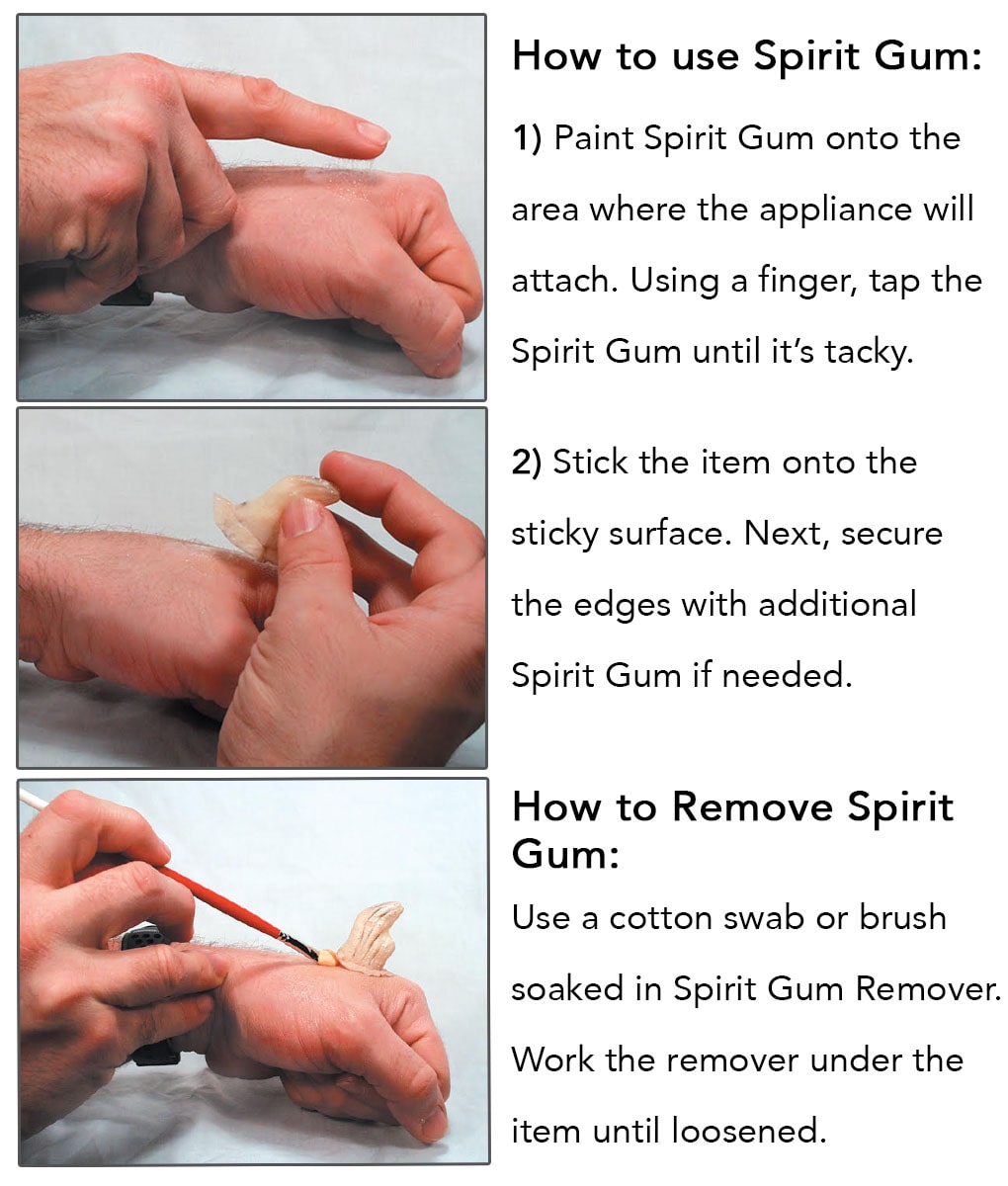 To use: Start with clean, dry skin. Paint Spirit Gum onto the area where the appliance will attach. Tap it until it becomes tacky. Stick on the item and secure the edges with additional adhesive if needed. Remove with Spirit Gum Remover.