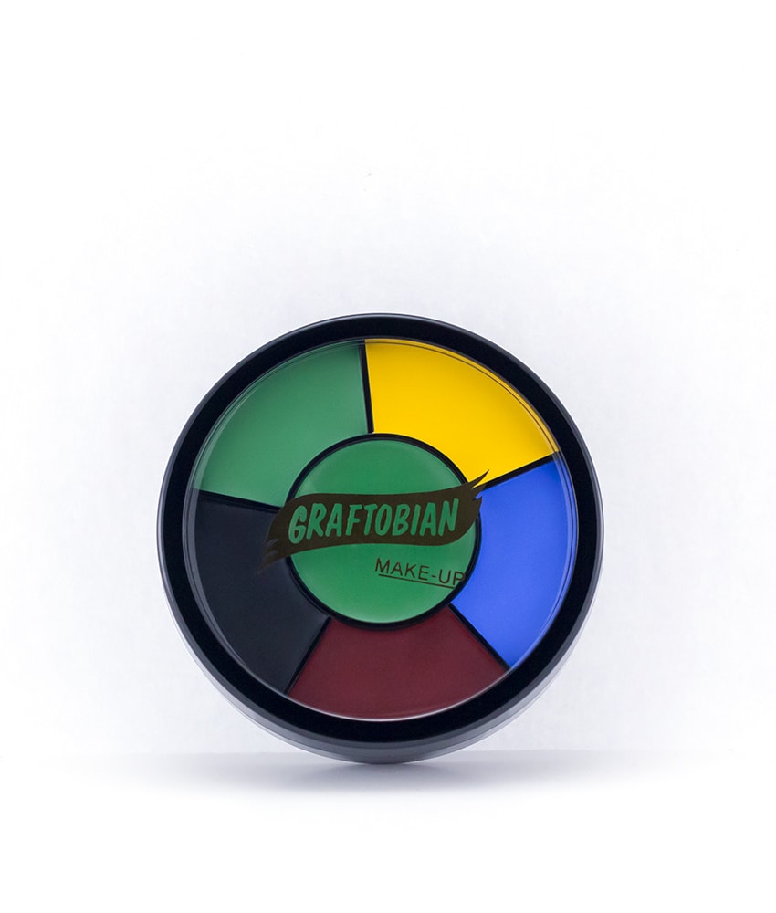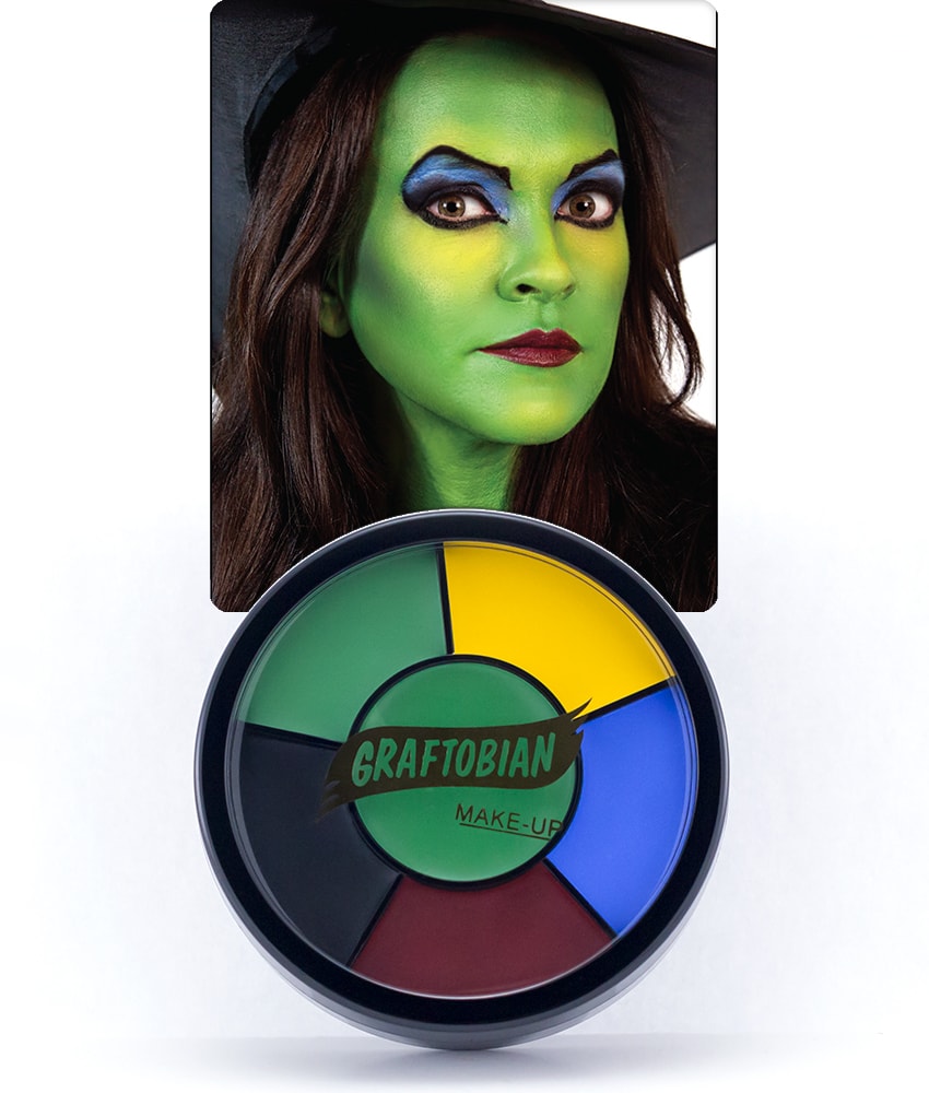 The Witch Makeup Wheel includes Theatrical Creme Foundations in Green, Yellow, Deep Misty Blue, Maroon, and Black.
