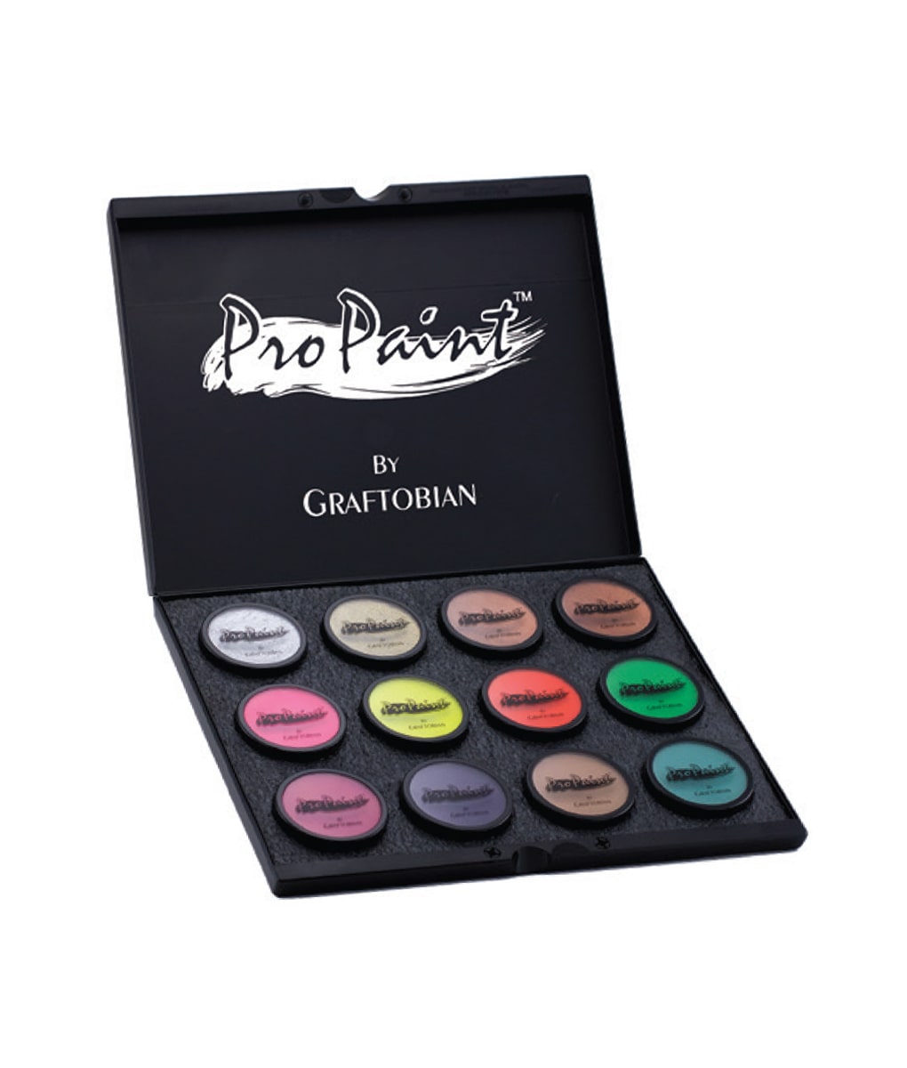 ProPaint™ comes in four Master Box sets. Master Box 2 contains four metallic colors, 4, neon shades and 4 bonus classic colors. Use the four metallic shades Steampunk accents, royal gowns and jewelry, or other shiny features. The four neon colors make amazing hair streaks and nail art. Also, the four included classic shades are a great addition to any artist's palette. The sleek and durable laptop-style snap case is easy to clean and keeps your paints neatly organized. Remove the containers with ease when working and then pop them back into the foam holder for easy transport. Master ProPaint™ Box 2 is surely a perfect way to round out your body paint collection.