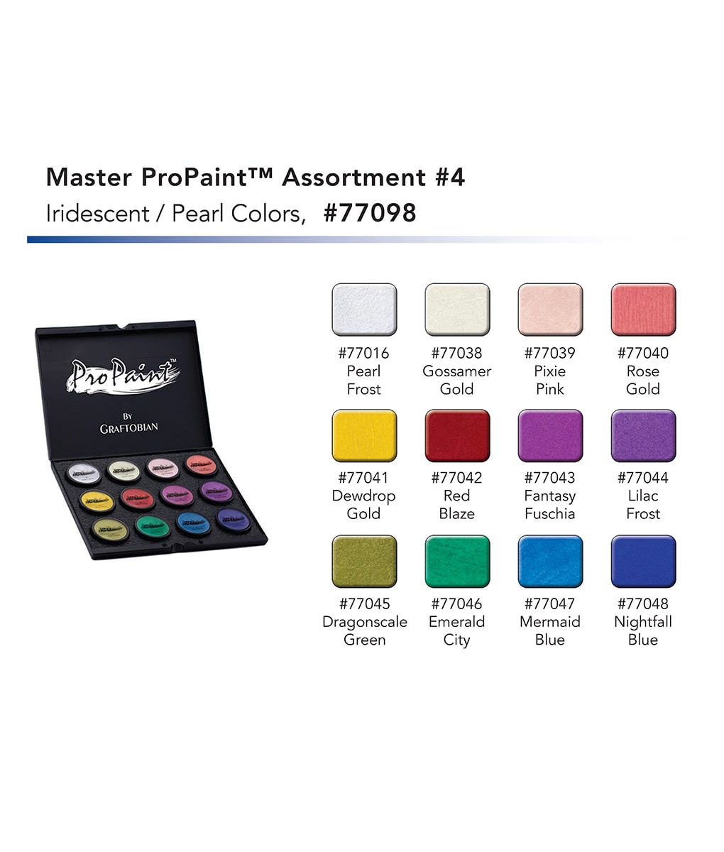Master ProPaint™ Box 4 includes -- Pearl Frost, Gossamer Gold, Pixie Pink, Rose Gold, Dewdrop Gold, Red Blaze, Fantasy Fuchsia, Lilac Frost, Dragonscale Green, Emerald City, Mermaid Blue, and Nightfall Blue. The sleek and durable snap case is easy to clean and keeps your paints neatly organized.